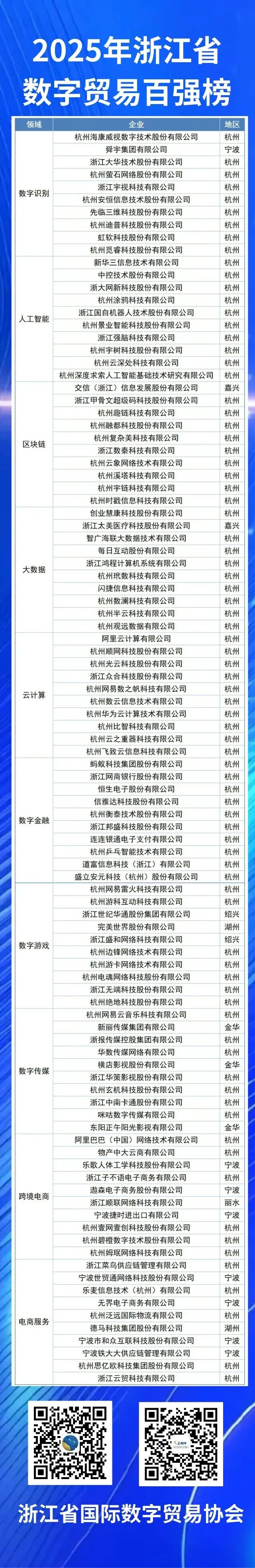 数字贸易百强榜 徐斌毅在发布时表示,榜单遴选设数字化绩效、数字化程度和行业影响力三大一级指标和9个二级指标,在立足全省数字贸易发展特色及新业态、新模式的前提下,遵循科学性、系统性、可操作性的原则,依托多年积累的企业大数据,经初选、复选和终审后最终形成。 百强榜聚焦数字技术贸易、数字服务贸易、数字产品贸易、数据贸易及跨境电商五大核心领域,选取了10个具有浙江产业辨识度的细分行业,包括数字识别、人工智能、数字金融、区块链、数字游戏、数字传媒、大数据、云计算、跨境电商和电商服务,全面展现浙江数字贸易生态的多维布局与创新活力。榜单中涵盖上市公司36家,独角兽和准独角兽企业25家,行业领军企业18家,高新技术企业71家,以及“专精特新”企业29家。