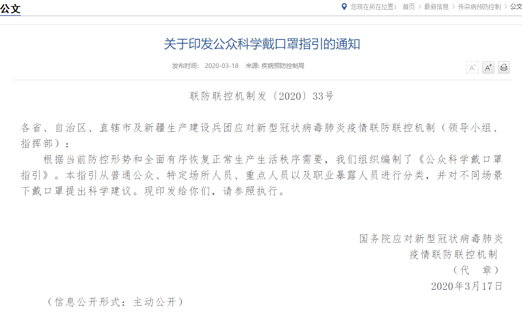 3月18日,国家卫健委网站发布《关于印发公众科学戴口罩指引的通知》,对不同场景下戴口罩提出科学建议,全文如下。