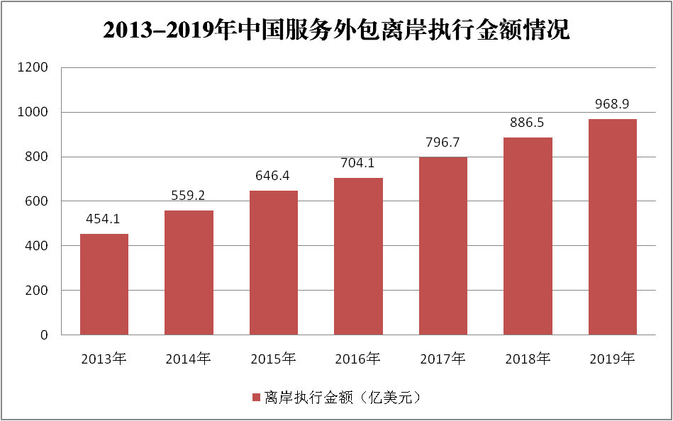 随着离岸外包在发达国家的发展,近年来越来越多的国家加入到国际服务外包中来。参与国际服务外包可以促进现代服务业的发展,提升我国在国际分工体系中的地位,2019年中国离岸服务外包合同额1389.1亿美元,同比2018年增长15.4%,离岸执行金额达968.9亿美元,同比2018年增长9.3%。