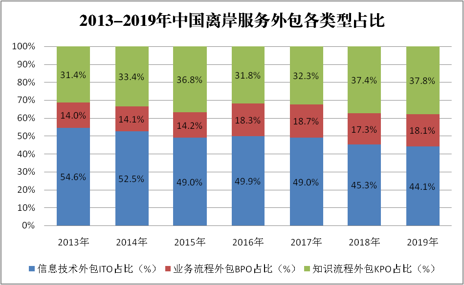 分类型来看,2019年中国离岸信息技术外包(ITO)执行额为2894.3亿元,同比增长9%,占比44.1%;离岸业务流程外包(BPO)执行额为1183.9亿元,同比增长30.4%,占比18.1%;离岸知识流程外包(KPO)执行额2477.6亿元,同比增长7.6%,占比37.8%。