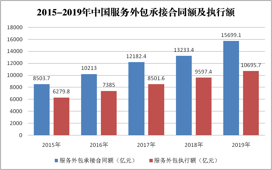 我国服务外包行业起步较晚,正式纳入国家发展计划最早是在2006年,从“十一五”规划以来,国家有关部门的重视触发了我国服务外包行业发展的引擎,作为新兴业态的主要增长点,近年来许多基于互联网的外包模式不断涌现。2019年中国服务外包承接合同额为15699.1亿元,同比2018年增长18.6%,服务外包执行额为10695.7亿元,首次突破万亿元,同比2018年增长11.5%。