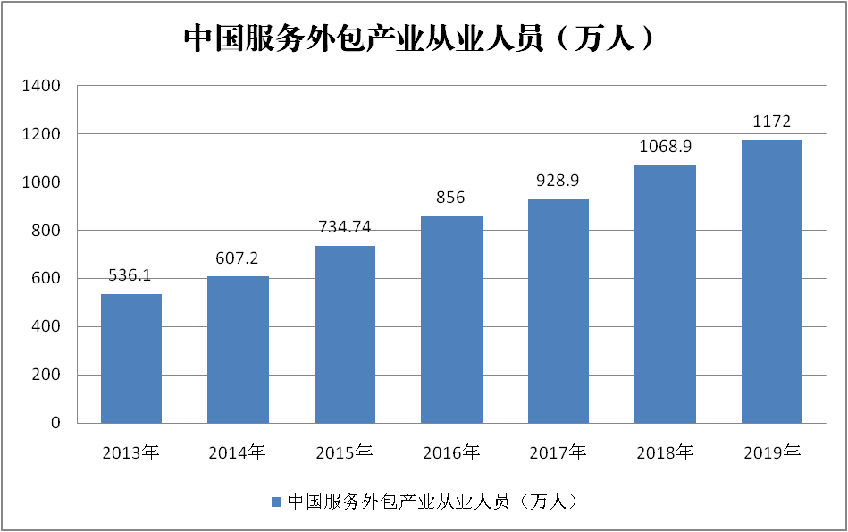 服务外包具有附加值大、资源消耗低、环境污染少、信息技术承载力高等特点,对于加快国内经济结构调整步伐,提升服务业竞争力,解决高校毕业生就业水平,具有重要意义。近年来随着服务外包加快转型升级,新兴就业形态不断扩展就业空间,2019年我国服务外包产业从业人员数量达1172万人,新增从业人员103万人,大学(含大专)以上学历合计750.1万人,同比2018年新增60.6万人,占从业人员总数的64%。