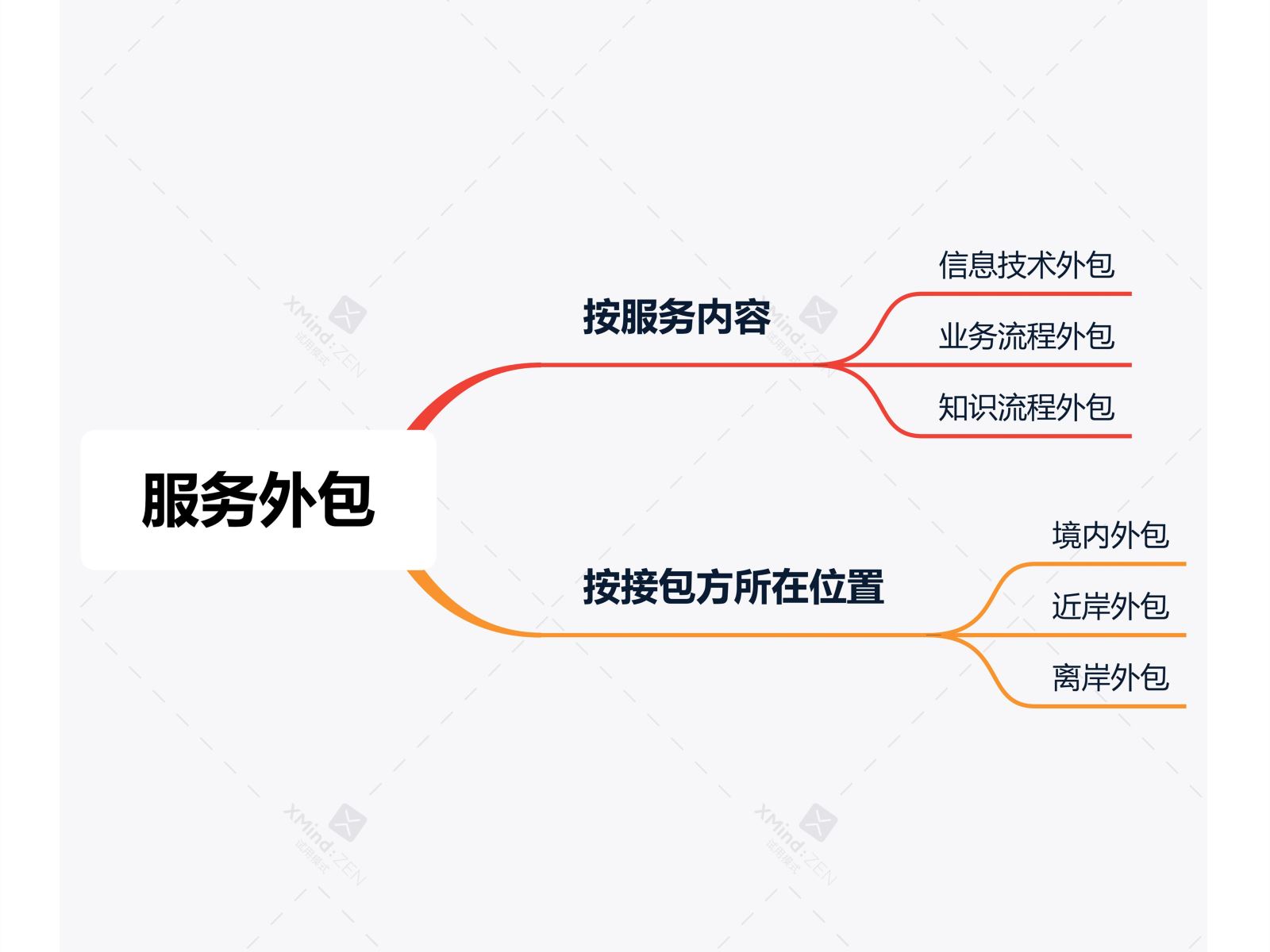 服务外包是指企业将其生产经营过程中的某些环节或流程交给专业企业提供,从而降低成本、提高效率和发挥各自优势。按服务内容划分,服务外包主要分为信息技术外包、业务流程外包和知识流程外包;按接包方所在位置划分,又可分为境内外包、近岸外包和离岸外包。