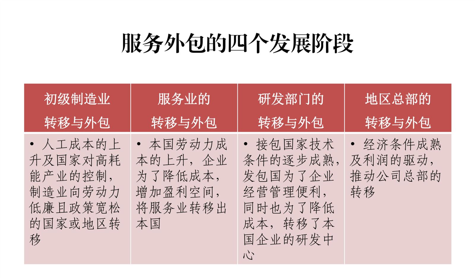 目前,服务外包正以开放共享、创新融合的模式加固经济全球化和服务贸易自由化桥梁,服务外包的发展主要分为四个阶段,分别是初级制造业的转移与外包、服务业的转移与外包、研发部门的转移与外包、地区总部的转移与外包。