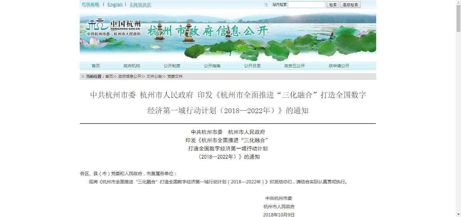 关于印发《杭州市全面推进“三化融合”打造全国数字经济第一城行动计划(2018—2022年)》的通知 时间: 2018/10/10 9:07:43 |