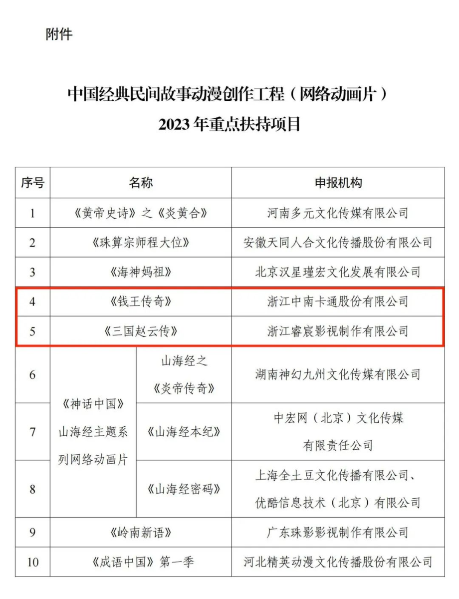 根据中办、国办《关于实施中华优秀传统文化传承发展工程的意见》中关于“实施中国经典民间故事动漫创作工程”的要求和有关工作部署,国家广播电视总局积极组织开展“中国经典民间故事动漫创作工程(网络动画片)”征集评选工作。 经专家评审,国家广播电视总局确定了10部网络动画片作为2023年重点扶持项目,其中浙江有2部动画片入选。