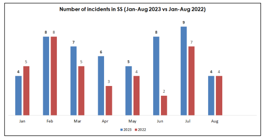 1月至今,新加坡海峡已发生51起抢劫事件。亚洲反海盗信息共享中心制图(下同) 亚洲反海盗信息共享中心在报告中总结称,加上7日至9日的4起事件,自今年起至今,马六甲海峡和新加坡海峡共报告了55起事件。其中,51起发生在新加坡海峡,4起发生在马六甲海峡。马六甲海峡和新加坡海峡都属于世界上最繁忙和最重要的水道,两条水道连接着印度洋和南中国海,是东南亚国家的重要贸易路线。然而,该地区多年来一直受到海盗事件的困扰,并且呈现上升趋势。亚洲反海盗信息共享中心收集总结的数据显示,2021年全年,亚洲去年82起海盗抢劫事件,新加坡海峡占六成;2022年全年,马六甲海峡和新加坡海峡共报告了55起抢劫事件,全部发生在新加坡海峡。