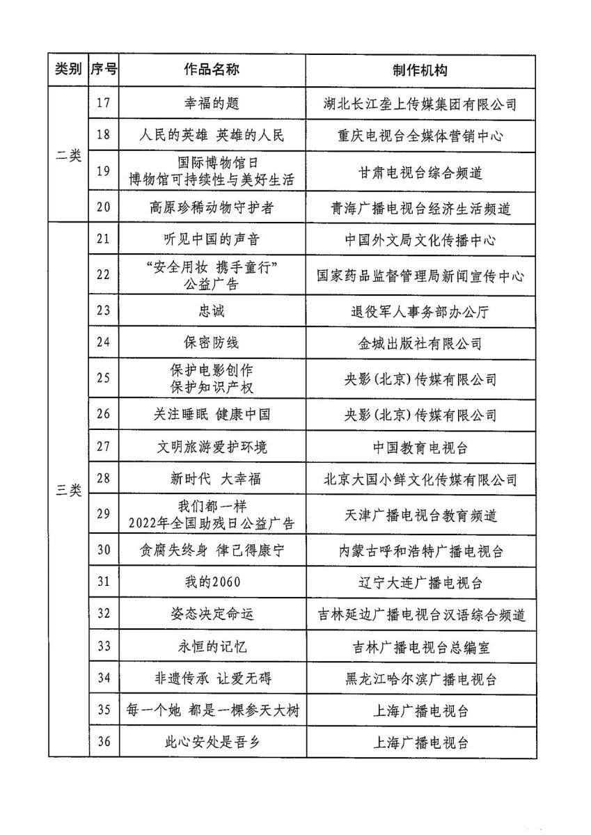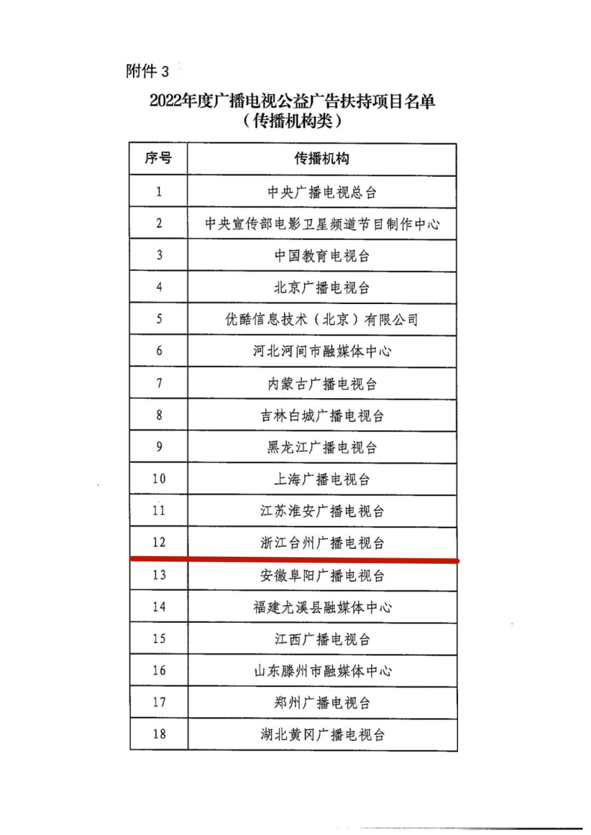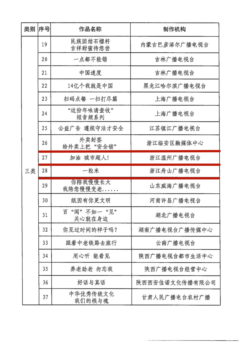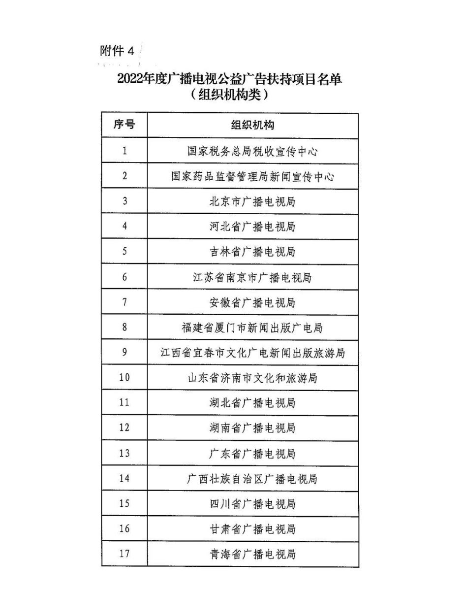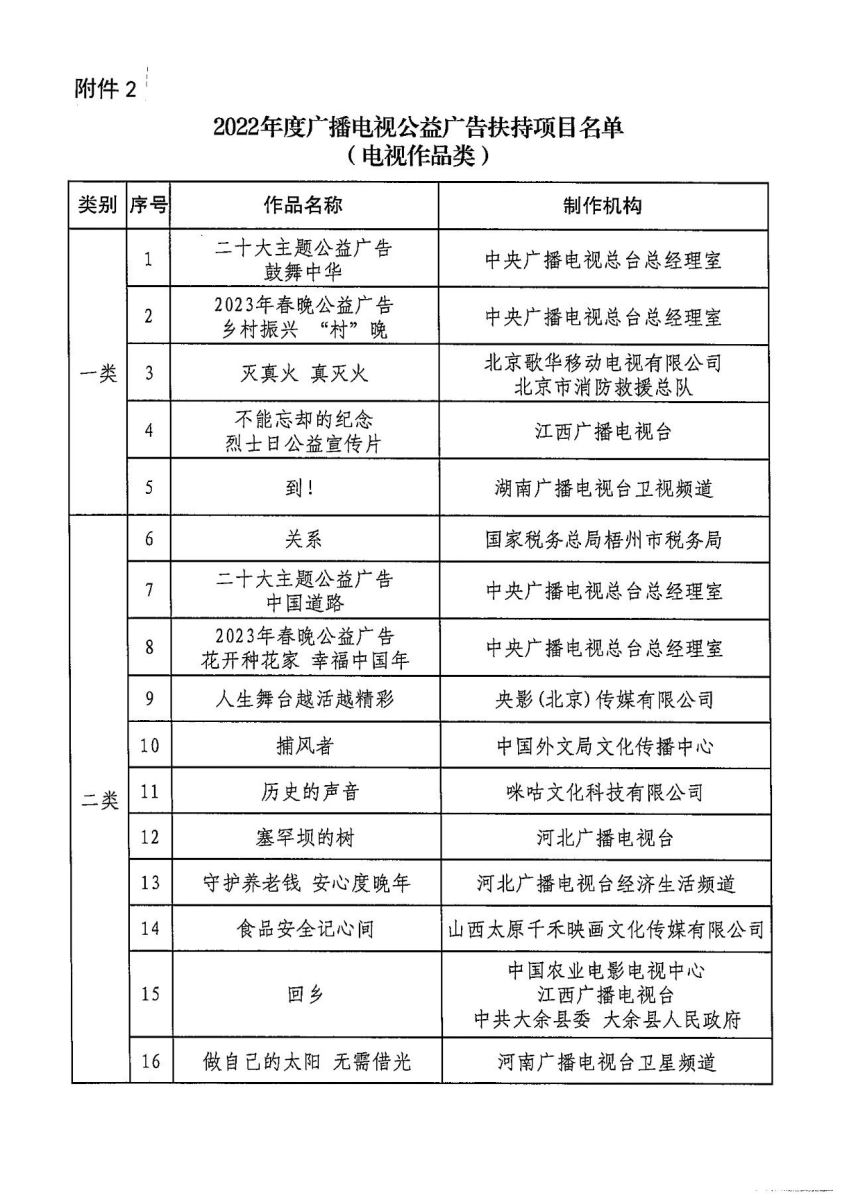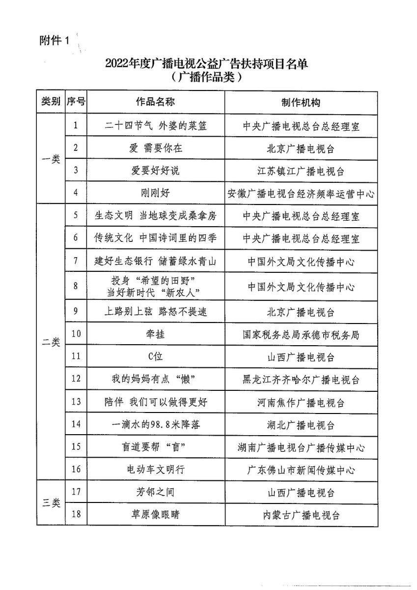 为引导和鼓励广播电视公益广告制作播出,提高公益广告质量,广电总局今年继续开展广播电视公益广告扶持项目评审工作。经省级广电主管部门、中央有关单位推荐,广电总局评审委员会审核并公示,最终确定2022年度广播电视公益广告各类扶持项目。 由浙江临安区融媒体中心制作的《外卖封签给外卖上把“安全锁”》、浙江温州广播电视台制作的《加油 城市超人!》、浙江舟山广播电视台制作的《一粒米》入围了本次扶持项目广播作品类名单;浙江电视台国际频道制作的《数字 孕育无限可能》和浙江电视台浙江卫视制作的《宋韵二十四节气系列 夏至》入围本次扶持项目电视作品类名单;浙江台州广播电视台入围本次扶持项目传播机构类名单。 广电总局将向获得扶持的广播作品、电视作品和传播机构、组织机构颁发证书,并向广播作品和电视作品发放扶持资金。 广播作品和电视作品扶持资金标准如下: (一)广播作品。每部一类作品扶持资金6万元,每部二类作品扶持资金4万元,每部三类作品扶持资金2万元。 (二)电视作品。每部一类作品扶持资金18万元,每部二类作品扶持资金12万元,每部三类作品扶持资金8万元。 扶持资金由广电总局拨至省级广电主管部门和中央有关单位,省级广电主管部门和中央有关单位负责将资金分发至获扶持的单位及个人。扶持资金须严格按照有关规定专款专用,受扶持单位应将扶持资金用于广播电视公益广告的策划、制作和播出等相关工作。