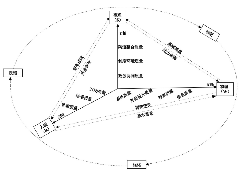 数字政府政务服务质量综合评价。由一级指标模糊隶属度及相应指标权重得出政务服务质量的综合评价结果。由结果可知,“差”的隶属度为0.0353,“较差”的隶属度为0.1689,“一般”的隶属度为0.3654,“较好”的隶属度为0.3743,“好”的隶属度为0.0561。根据加权平均原则,对评价结果按照1~5分进行赋分,得出浙江省政务服务质量的量化分数为3.2469(满分为5分)。 5.2 结果分析 根据AHP-FCE评价结果,浙江省数字政府服务质量整体较好,但仍存在一定的提升空间。按照最大隶属原则,浙江省数字政务物理维度和人理维度的服务质量评价均为“较好”,而事理维度的服务质量评价为“一般”。本研究从物理维度、事理维度和人理维度对此次评价结果分析如下。 物理维度:总体来看,浙江省在数字政府服务平台建设方面得到绝大多数测评用户的高度认可,表明浙江省在打造数字政府的过程中,十分重视网站基础建设,善于运用先进技术提高政务服务质量。只是在智能化服务推送、透明化政务信息和精准检索信息方面的服务还需进一步提高;事理维度:从权重来看,事理维度虽占据重要地位,而在实际生活中,其服务质量还远不能达到用户的期望。无论是政府支持力度、规章制度建设、制度压力,还是资源共享程度、联合办公程度,一半以上的受访用户认为其表现均为“一般”,这说明浙江省政府未能从组织和系统管理的角度出发,研究组织制度的制定以及组织内部政务协同运行等问题;人理维度:浙江省数字政府政务服务在人理维度的服务质量总体较高。八成左右的测评用户对互动沟通时效性、用户需求响应性、用户处境同理心等评价指标表示满意,表明政府更多的是站在用户立场提供服务,注重提高与用户的有效互动及加强对政务服务事项结束后用户满意度的回访调查,而认为在问题处理主动性和用户投诉直达性上表现一般,说明浙江省政务服务还存在服务意识不足、未能切实简化用户投诉建议渠道的非必要环节等问题。 6 基于WSR方法论的数字政府服务质量提升路径 针对上述评价,基于物理事理人理之间的协同关系,本研究提出了数字政府政务服务的动态循环系统(如图2所示)。一方面,在物理事理人理因素的共同作用下,形成“创新-优化-反馈”的数字政府政务服务的外在循环路径:首先,政府部门基于自身内部建设,从线上线下渠道融合、制度环境改善、政务协同等方面,推进政务公开渠道建设、培养具有创新意识的政务人才、加快实现地方之间信息的互联互通,为更好地建设数字政务平台提供支持;其次,构建智慧化政务服务平台,应注重从系统运行与维护、满足用户检索信息的需求出发,持续优化用户政务服务体验;最后,在政民互动的过程中,用户对政府提供的服务给予评价,根据用户反馈,政府部门也更有针对性地展开政务工作。依此路径,可达到数字政府政务工作的良性循环,最终形成政府和公众的价值共创。